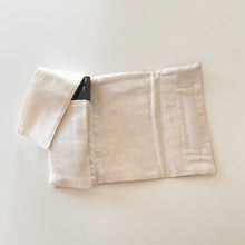 Bolsa para óculos com exterior em tecido plastificado e interior em flanela macia.