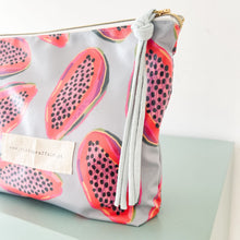 // Bolsa plastificada no interior e exterior. Fecho dourado, acabamento com fitas coloridas