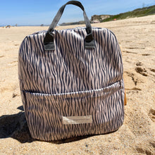 Mochila de tamanho grande em tecido plastificado inteiramente forrada com isolamento isotérmico para proteger o conteúdo do calor.